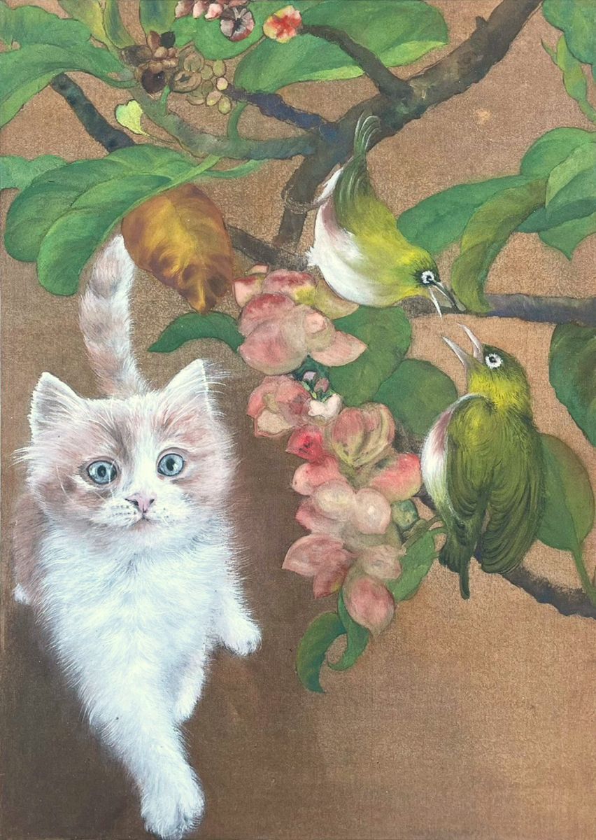 萬物於因緣中相遇,貓與鳥在凝視之間形成一種微妙張力。關係不僅是外在距離,更是覺知生起的契機。在彼此映照之中,觀者亦被引入一種對自身存在的體察。