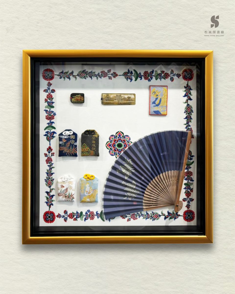 讓每一個御守都有自己的舞台。還加上小徽章、扇子等細節,彷彿把旅行回憶濃縮成一幅會說故事的畫。