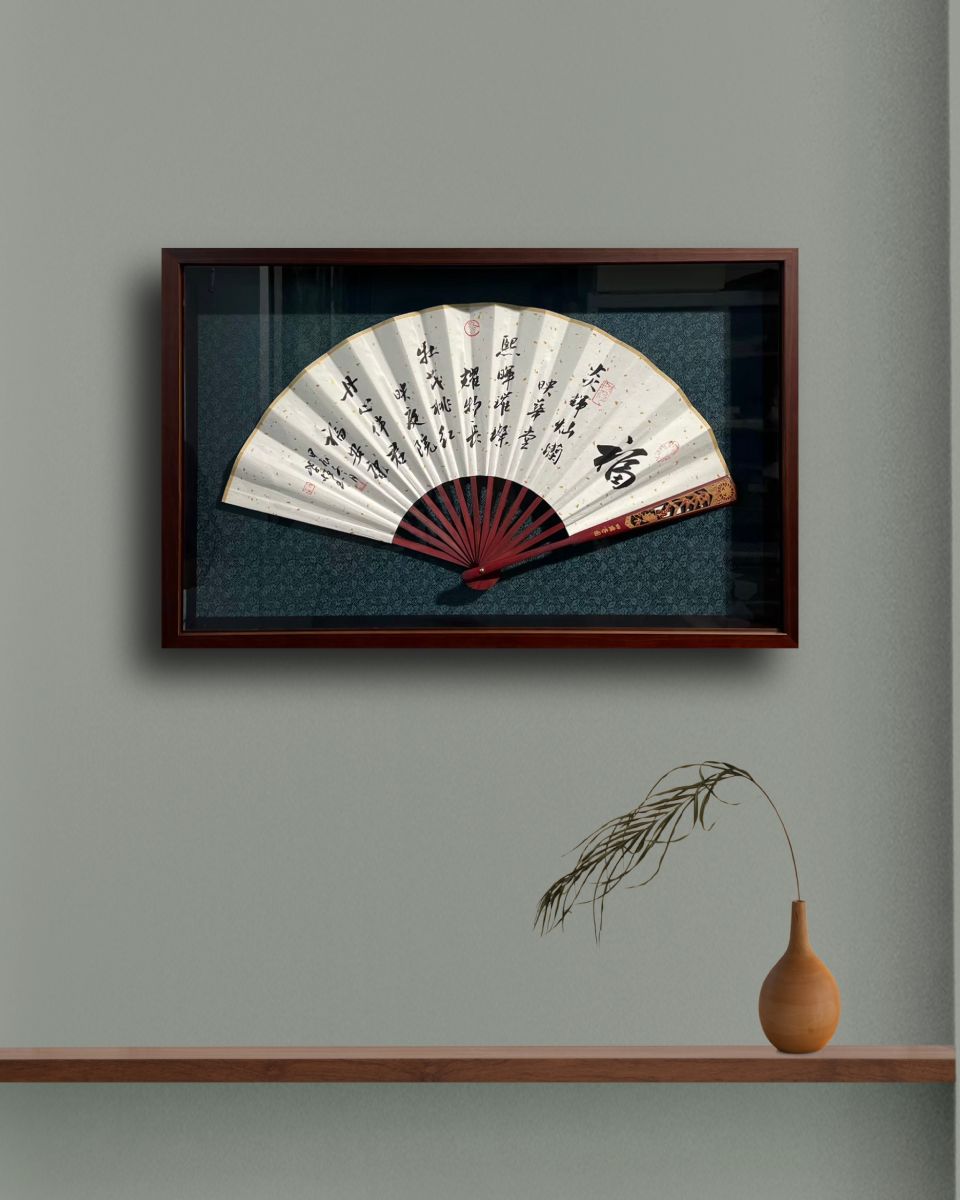 這次裱框作品以書法折扇為主角,筆墨流轉間,道出祝福與典雅氣息;