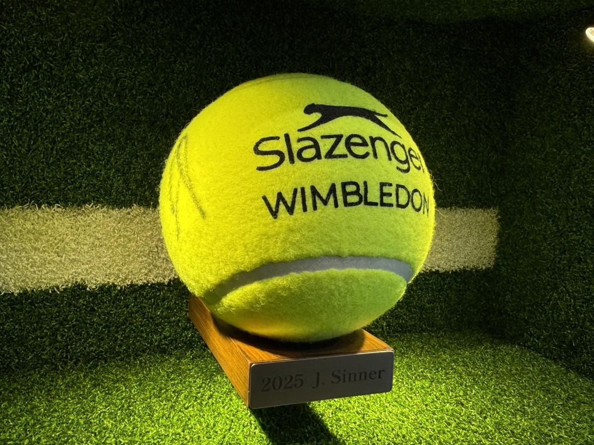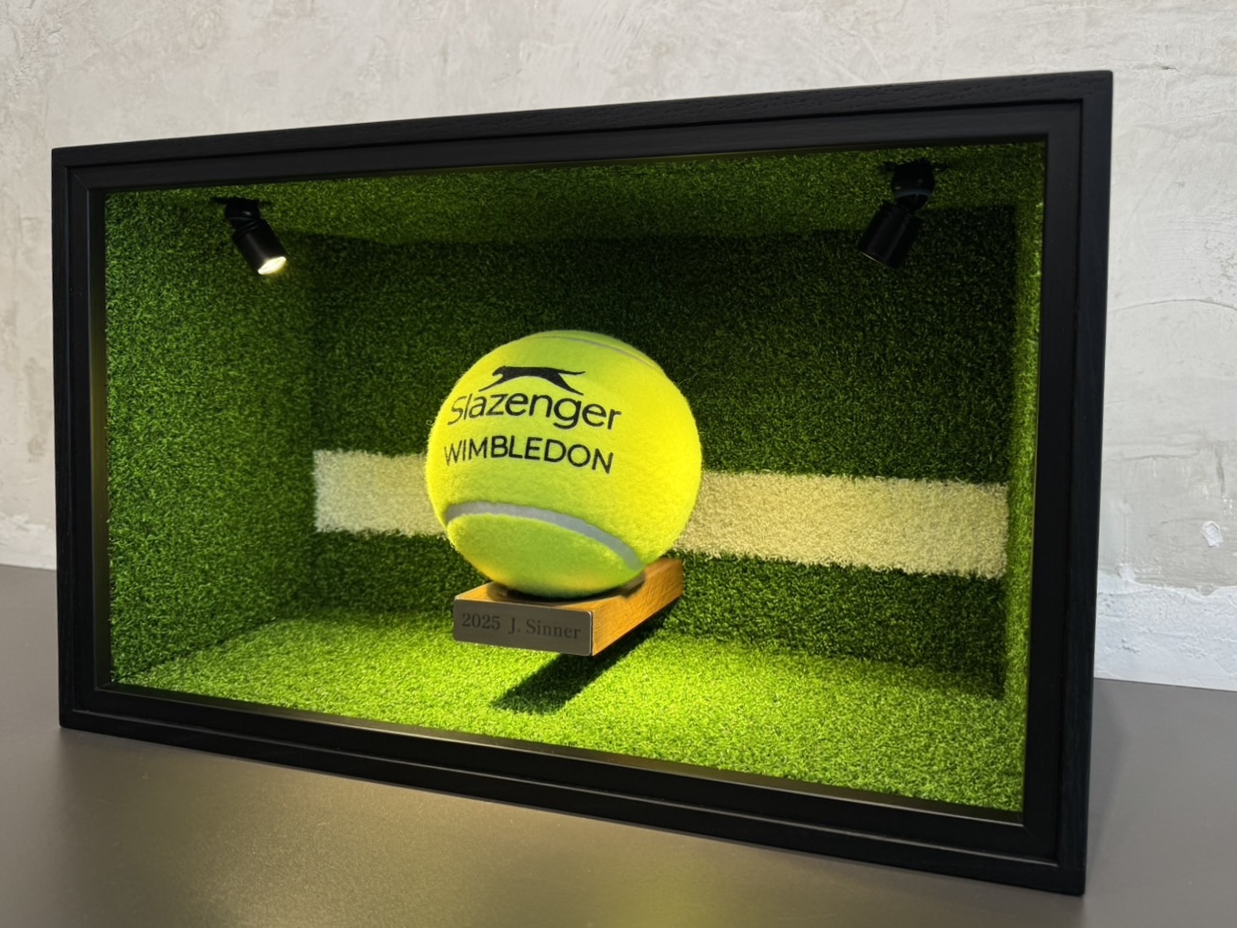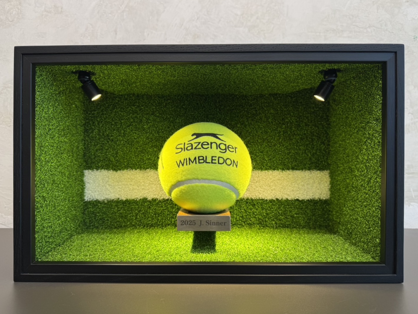 我們為這顆比賽球量身打造客製化手工裱框——從網球底座到刻有冠軍姓名的不鏽鋼名牌,更以溫布頓標誌性的草地與場線為背景,搭配內嵌聚光燈,讓每一次注視都能重溫那份激昂
