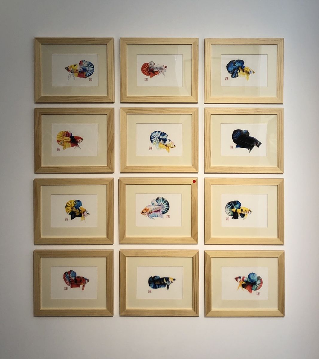 通過大量以及小尺寸的繪畫重現觀賞魚店裡擺滿裝著鬥魚的玻璃罐之感受。