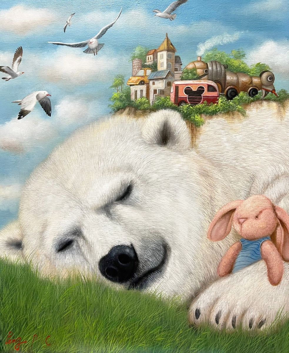 北極熊有如熟睡的小孩趟在舒適的環境裡,