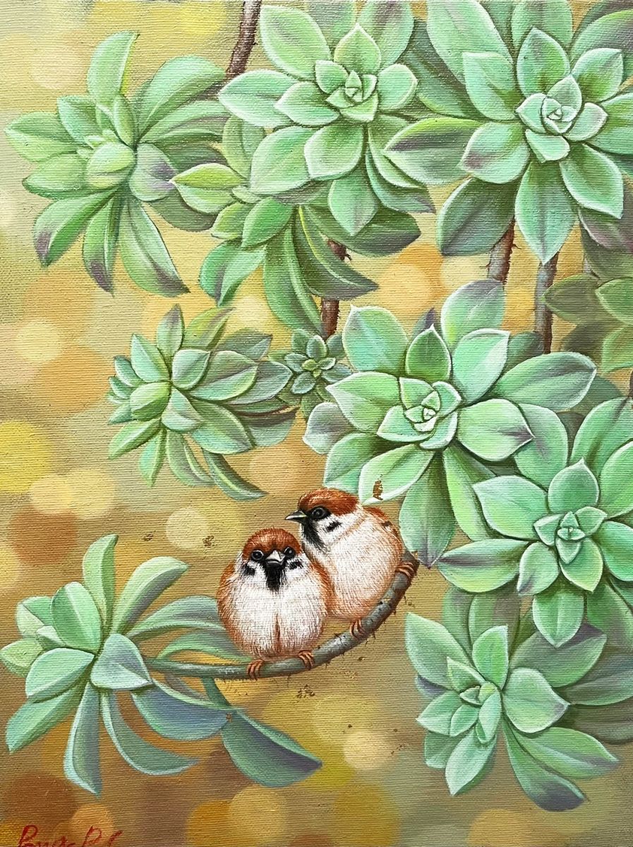 喜歡它的素雅低調不張揚,畫上兩隻麻雀護相依偎在一起,