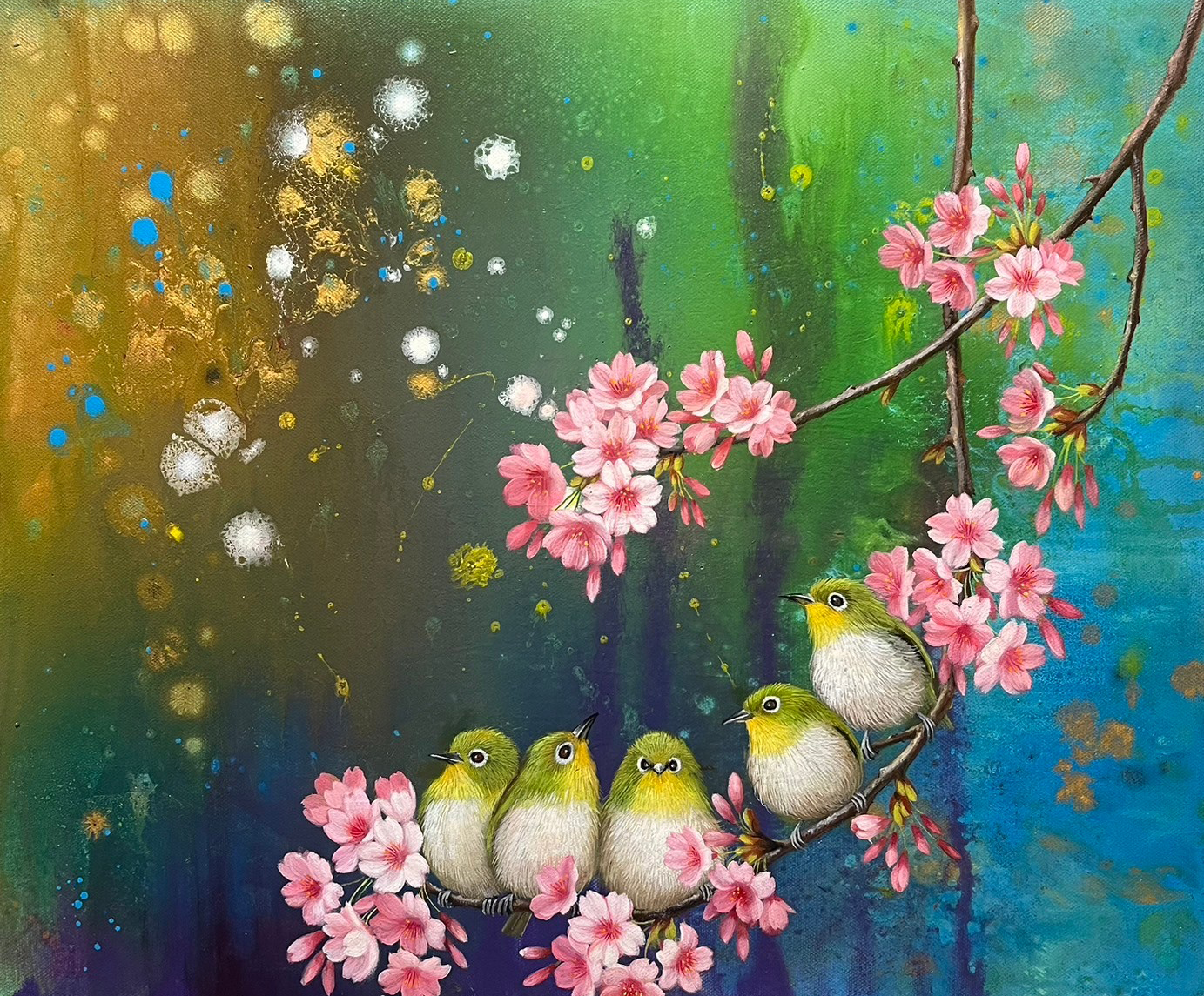 五隻小鳥似乎在鳴唱,寒冬將會過去,春天快來了。