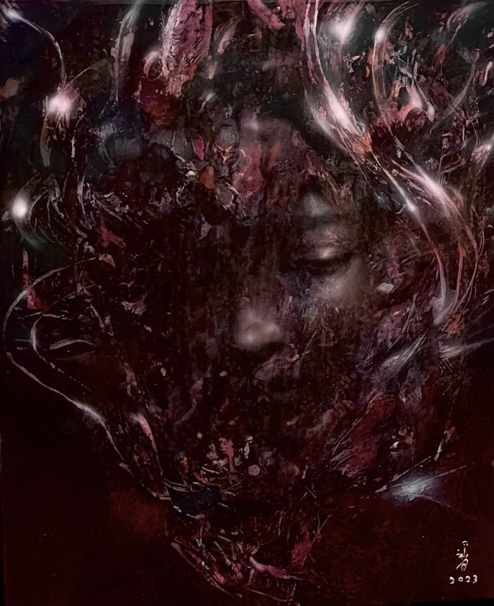 作品中的面容沉浸在流動的色彩之中,似乎在混沌與紛擾間尋找一片寧靜的自我。 眼雖閉,卻彷彿感知著世界的脈動,在喧囂中保持內心的凝視。 靜觀,並非置身事外,而是超越表象,在深層的意識裡,看見更真實的世界。