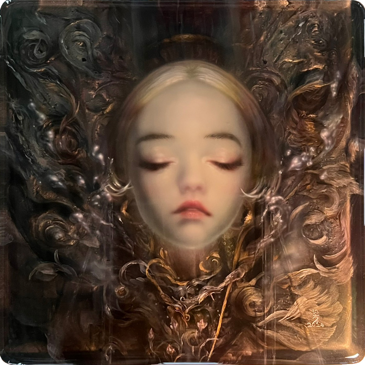 在這件作品中,生命的初現如同在後現代語境下對「真實」與「虛幻」之間邊界的再探索。閉目而立的面孔,彷彿成為時間的載體,流動的光影與交織的紋理,則暗示了一種超越具象描述的多重維度:是生命的原初形態,還是精神世界的投影?
