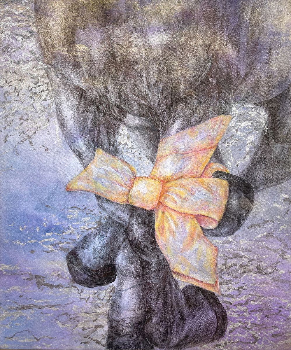 多彩的蝴蝶結彷彿是眾人看似華麗婉轉的「建議」,但在意外界言論之人,也因此容易受到影響與束縛,因此想將畫面呈現為一種看似美好,卻充斥障礙的負荷感,導致行事上的阻礙與過度恐懼外界。