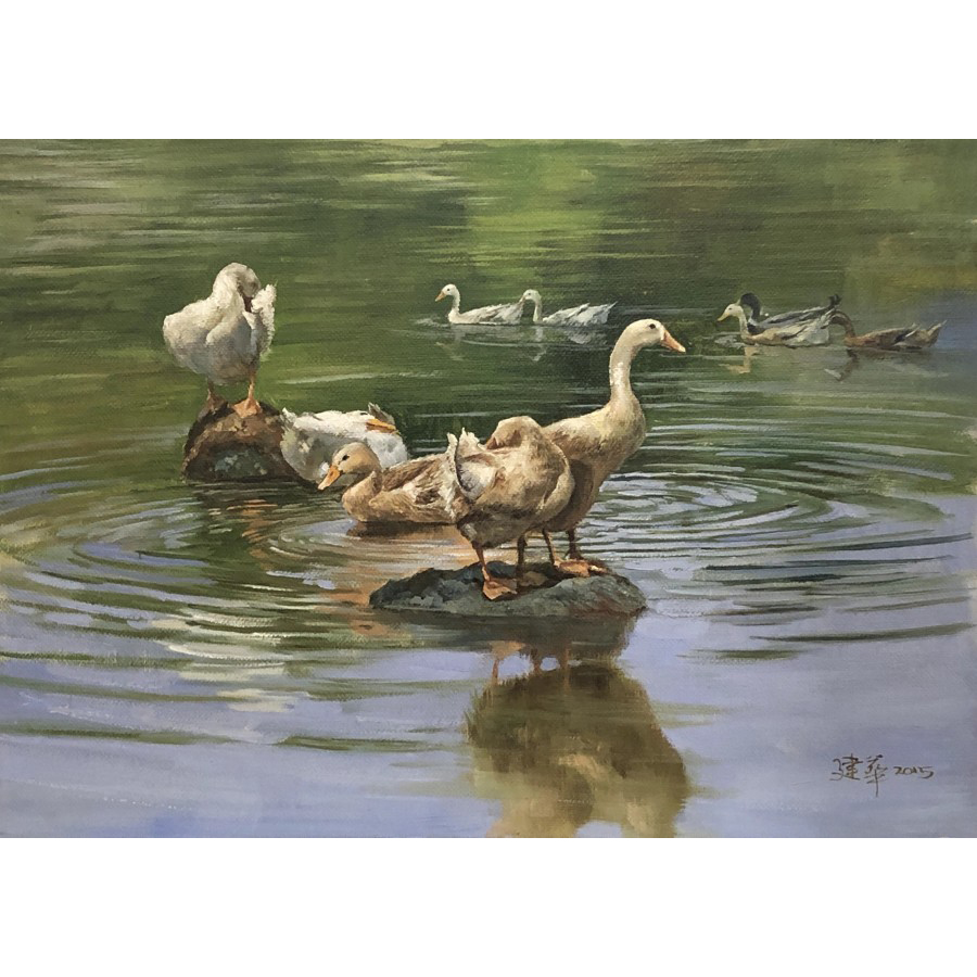 黃建華老師擅長描繪家禽動物,畫面中,鴨子於水里暢遊玩樂的景象,表現的生動活潑,又將湖水的清澈透亮表現的淋漓盡致