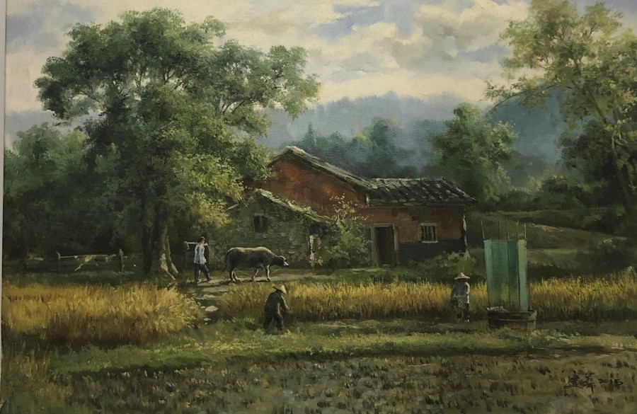 老師非常擅長描繪鄉村野外風貌,此幅作品為農人正值收割情景,樸實鄉趣,令人愜意