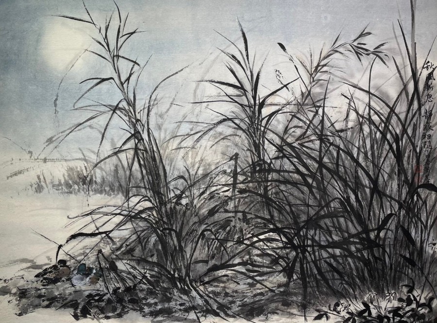 被狂風席捲而過的蘆葦草依然屹立,迷濛的月光下依稀看見相偎一起的雁鴨,好似人生的啟示:即便歷經風雨,一定有一個可以讓自己棲身歇息之處,月光依舊柔美,前景希望無窮。