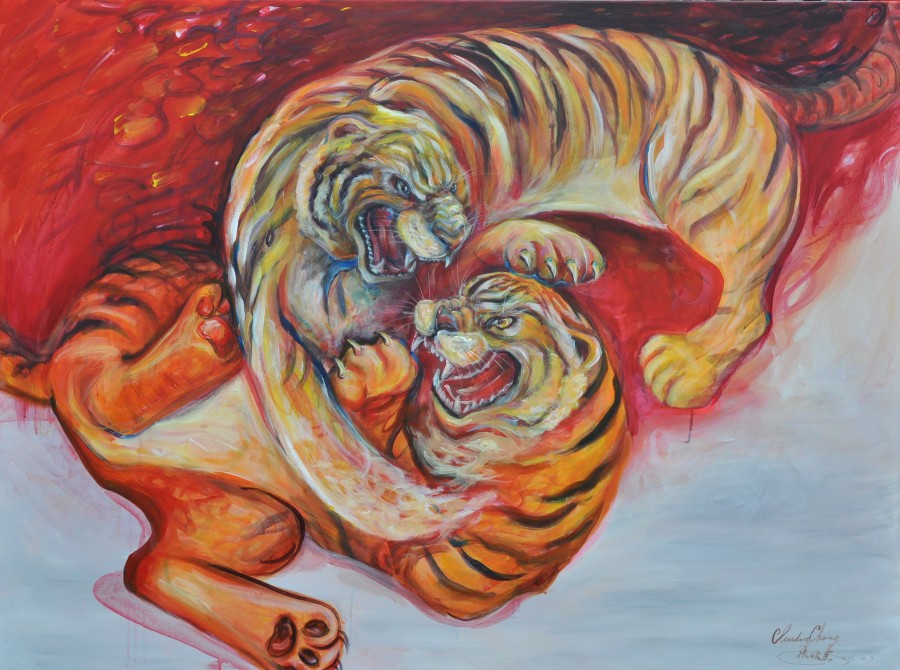 "兩虎怒長嘯,怒目相瞪傲,四掌武爪躁,居上立不搖。- 張綺芸作"