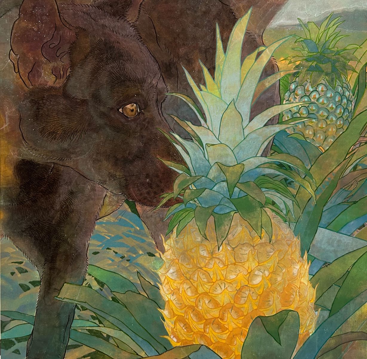 〈歐告旺來〉這件作品由台灣黑狗和金鑽鳳梨組合而成,
