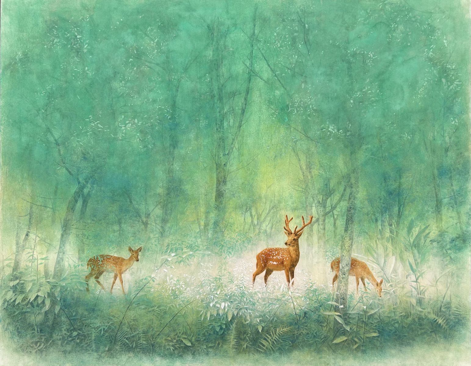 戴著皇冠的雄鹿,帶領家族於山林間遊走覓食,並不時的抬頭仰望,叮囑、保護著落後的小鹿,展現出王者風範。