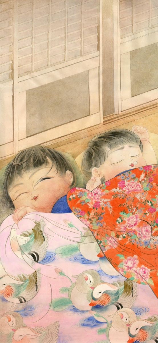 此作描繪的是兒時午覺時間總是不安份、想裝睡蒙騙家長再爬起來嬉戲的小孩子。