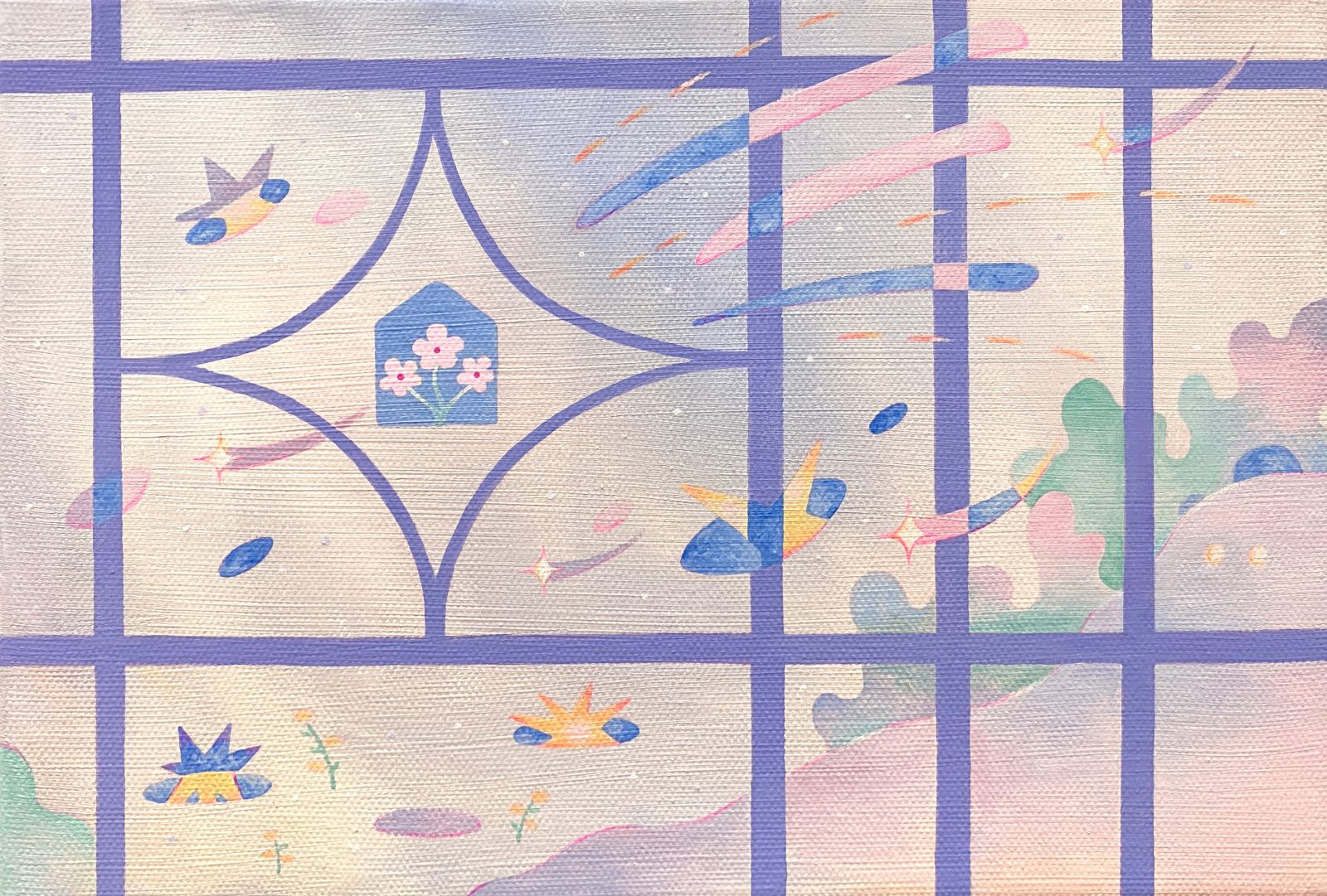 作品以流星為核心意象,將其與菱形鐵窗花相融合,而流星那短暫卻燦爛的閃爍,