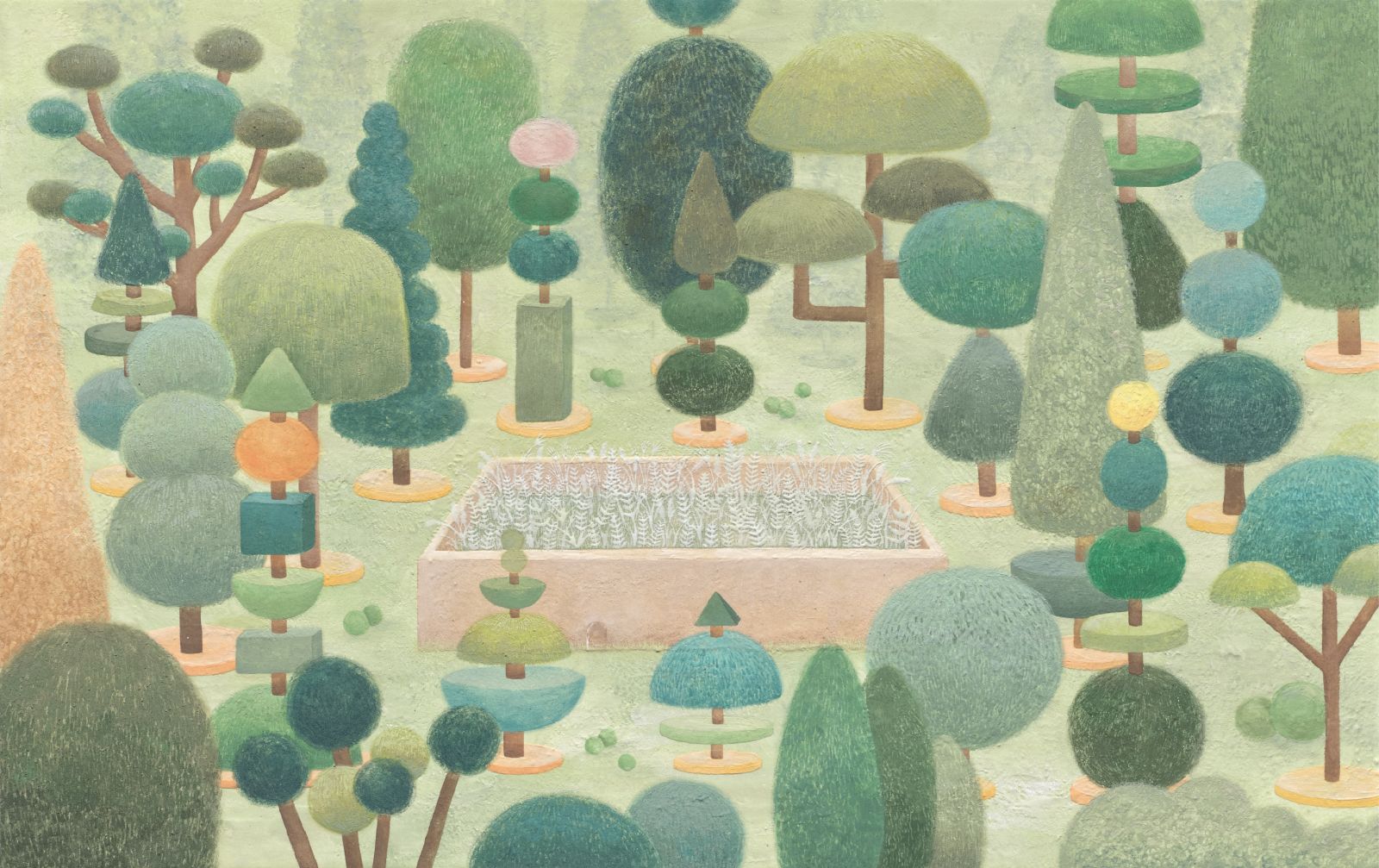 庭園是將自然框限在人們劃定的界線內,而作品「園中園」則象徵一片人造林與被圍欄圈養的一片自然野草林。 作品中以修剪過的樹木暗示人為的操作,它們如同玩具零件般被刻意安排擺放,與自由生長的野草形成鮮明對比。 在日常中隨處可見的雜草叢生的空地,這裡卻被特意框限、圈養起來,以突顯自然之物的稀有與珍貴,亦隱喻都市中難得一見的零星綠地。