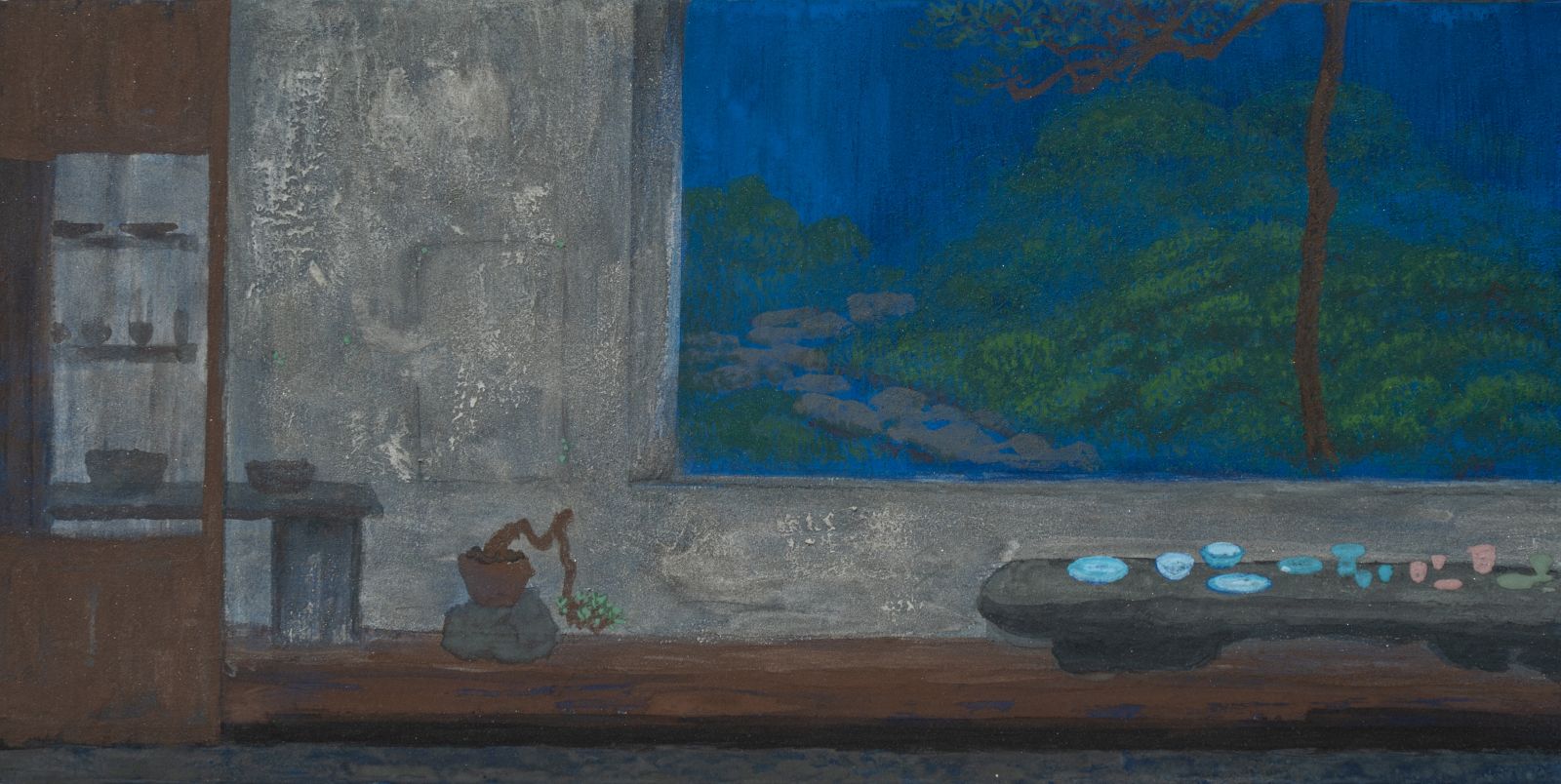 畫中可見遠方規整的山林造景,近景茶桌上的甜點、對弈中的棋局、剛修剪的盆栽園景⋯