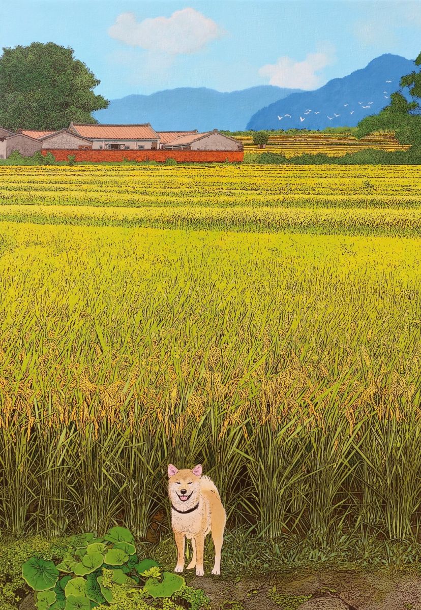 一隻神態悠然的柴犬站立於稻田邊緣,微笑的表情為整體畫面增添了一絲親切與生動的氛圍。其毛色與田野的金黃相互呼應,畫作構圖均衡,色彩運用柔和而富有層次,呈現寧靜而美好的田園景象,讓觀者感受到溫暖與放鬆。作品不僅展現了自然與人文的融合,也喚起人們對純樸鄉村生活的嚮往。