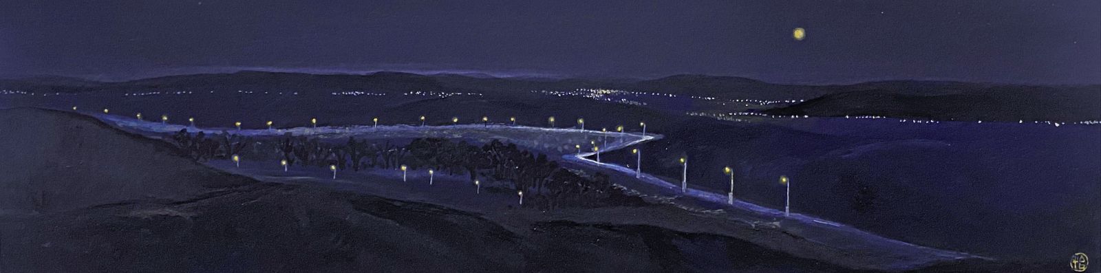以奮起湖的夜晚道路為取景背景,描繪了寧靜而深邃的夜色中,道路蜿蜒向前,遠處的車燈如流星般劃過寂靜的山間。