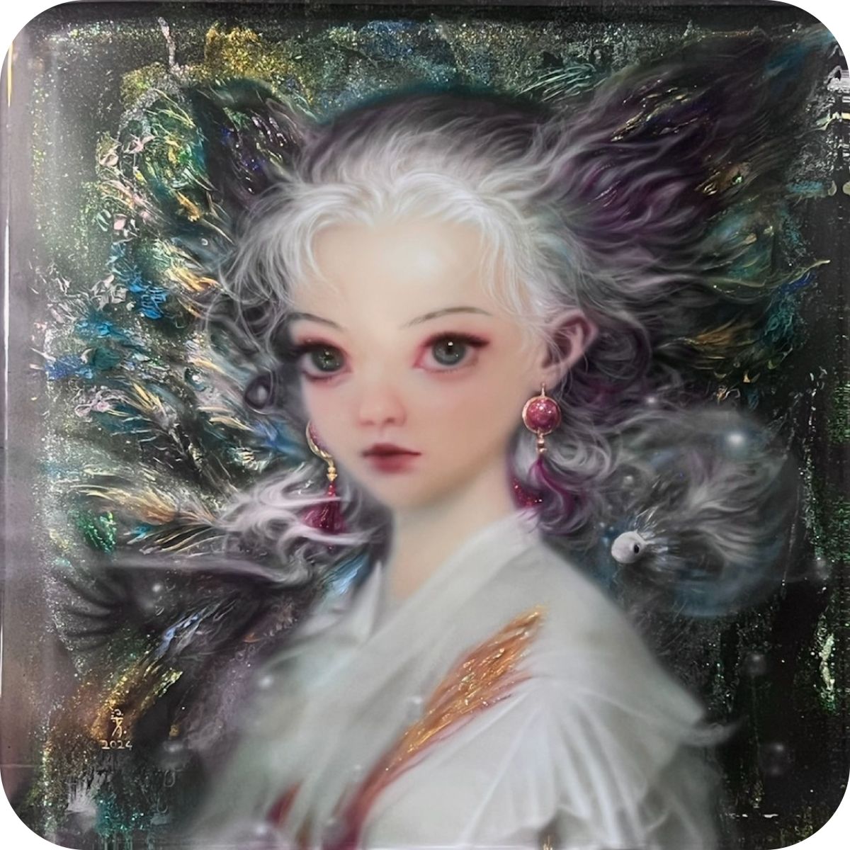 她靜靜地佇立在夜色中,髮絲如流光般與黑暗交織,目光深邃而遙遠。