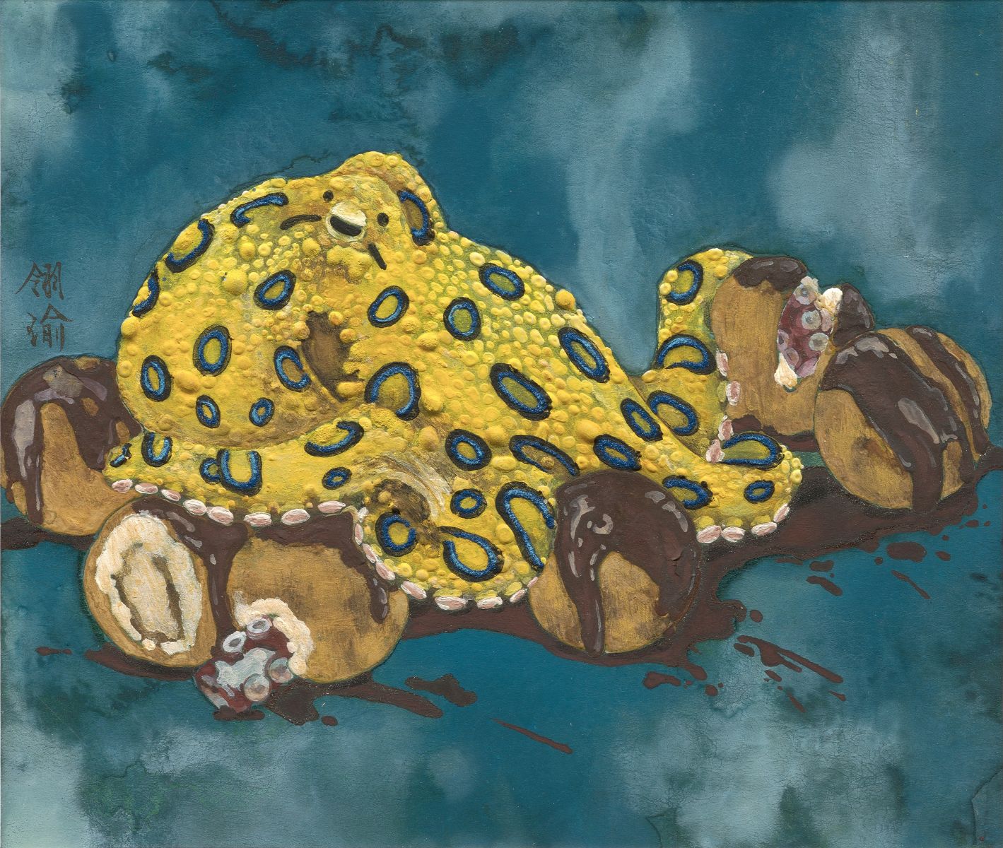 囂張的藍環章魚盤據章魚燒,瞇眼挑釁彷彿說:「咬啊,看你敢不敢!」一場食物鏈的逆襲正在上演。 The smug blue-ringed octopus sits atop takoyaki, squinting provocatively as if to say, “Go on, take a bite, I dare you!”