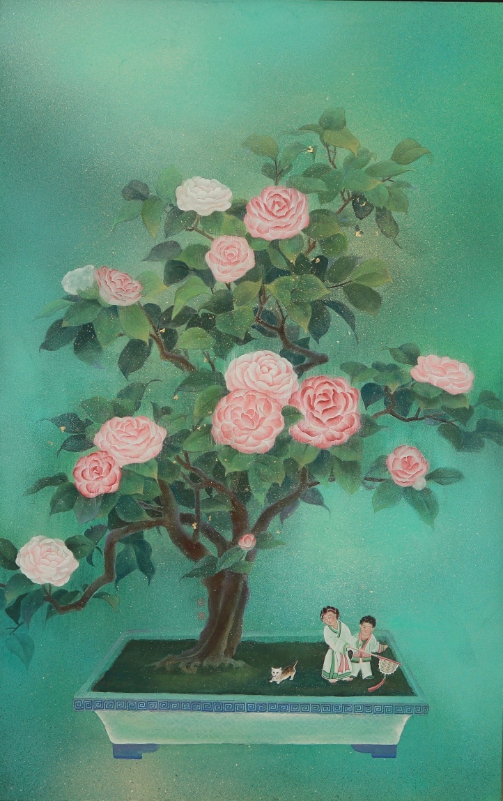 當我創作《花影下的遊戲時光》時,取材自宋代《嬰戲圖》中的人物,將他們輕輕安置於茶花盆景之中,讓天地一瞬錯位、尺度飄忽。