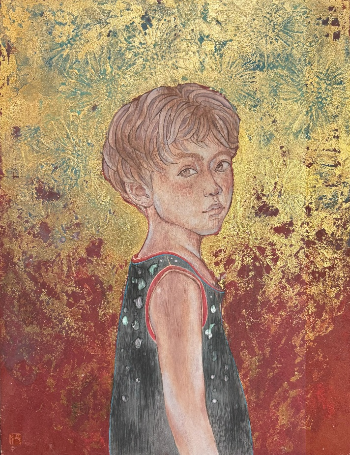 The figure’s eyes, both innocent and contemplative, reflect the delicate emotions that stir beneath the surface, while the shimmering, textured background evokes the warmth and depth of memory. Through this work, I hope to preserve the subtle beauty of that brief instant, inviting the viewer to pause, look back alongside the subject, and sense the tender grace hidden within the flow of time.