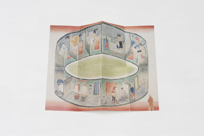 畫面描繪了公廁中發生的秘密趣事。我參考了日本浮世繪中的「掀頂式構圖」,將公廁的屋頂直接掀開,使觀者能夠清楚地窺視內部的一切。