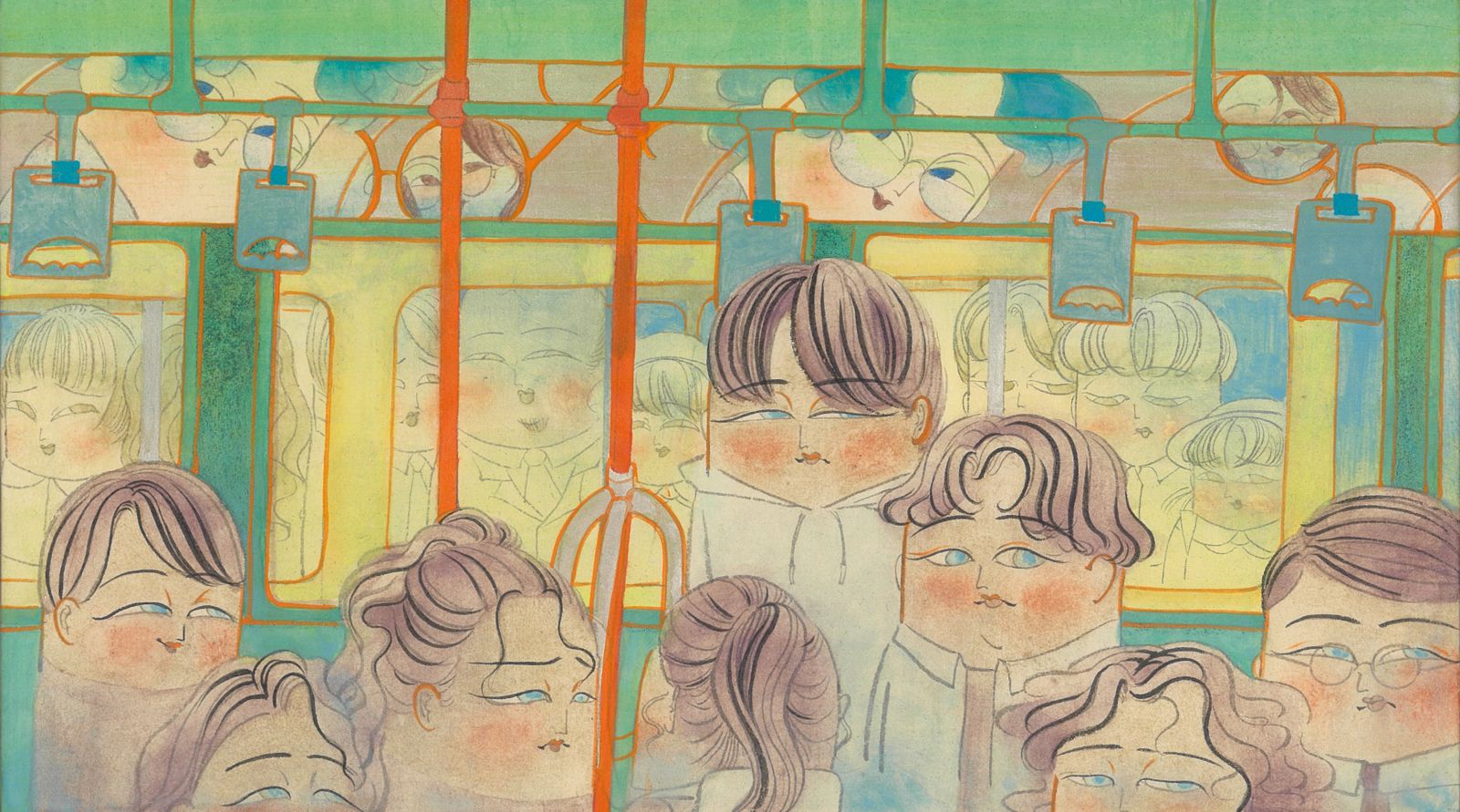 這一件作品描繪的是早晨通勤時刻裡,車窗裡、外、廣告看板之間有趣的觀看關係。