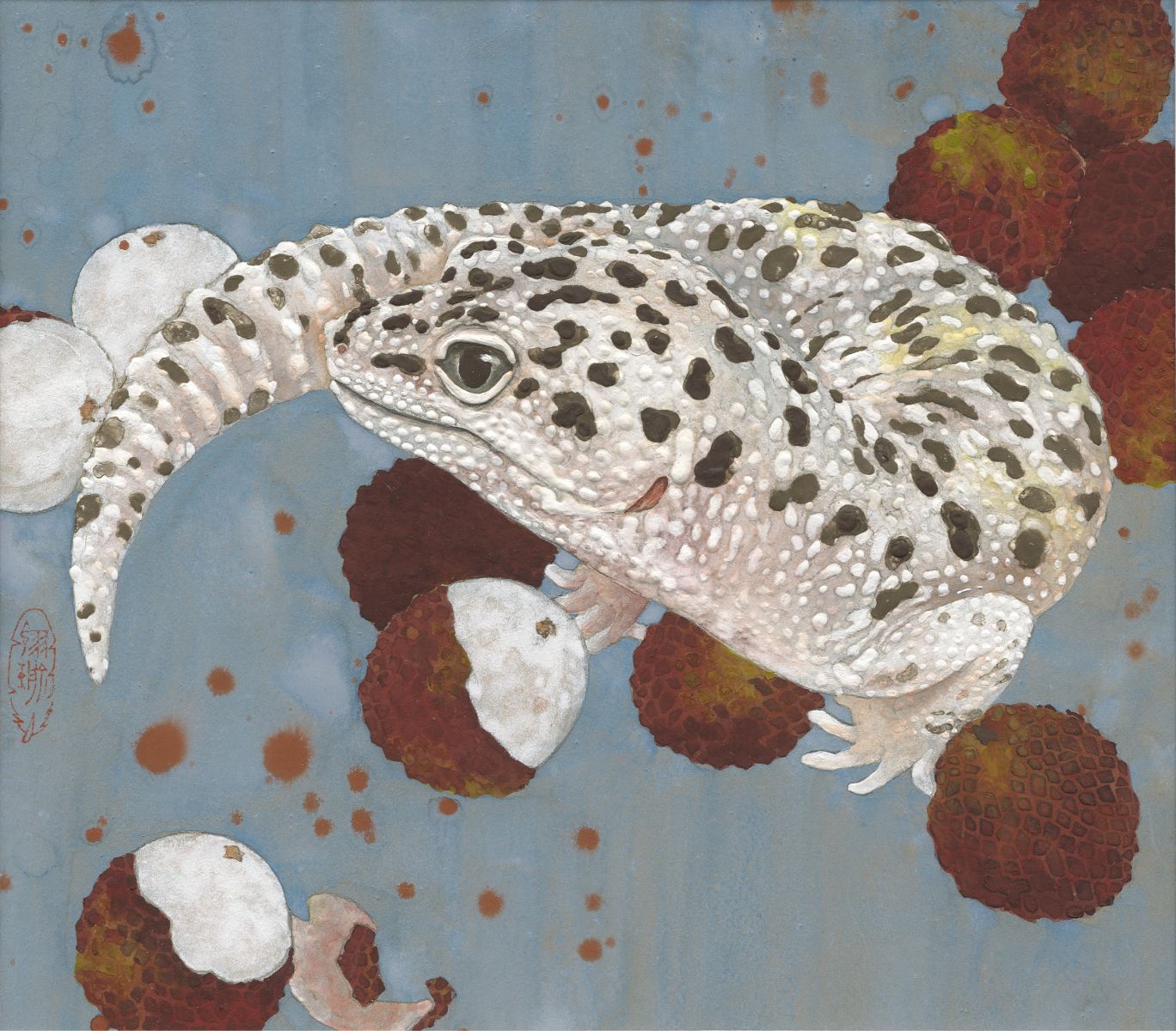 撥開荔枝時,果肉邊竟蠕動著一隻肥蟲,那觸感近似守宮的尾巴,驚喜中帶著毛骨悚然的錯愕。我將這突兀的記憶拼貼重組,描繪出一種甜美與不安交錯的瞬間。